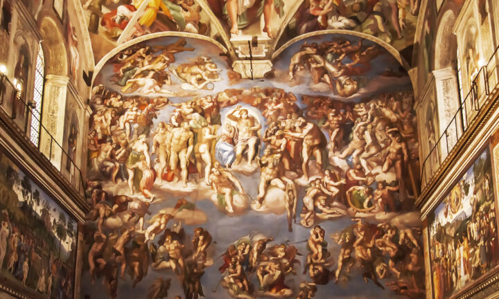「最後の審判」の壁画は、雲の上に立っているイエス・キリストを中心に描かれています。キリストは若く、容姿端麗で力強く右の手を上げ、大公無私で優れた正義感を以って判決を下します。善人を天国に導き福報が得られるようにします。左の掌で、邪悪を阻止し、罪人を地獄に沈めるように下へ押さえています。悪人には悪の報いがあります。キリストの掲げた右手は、この世のすべてのものを一瞬にして最終的な判決を下し、すべてに決着をつけるかのようです。 この荘厳な建造物には、無限の慈悲と威厳が顕わされおり、人々は神の偉大さと