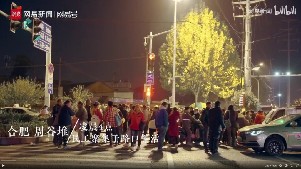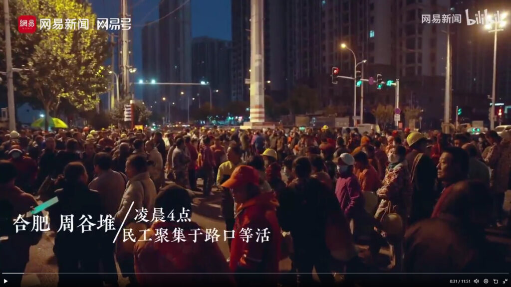 合肥市には、出稼ぎ労働者が集まる「仕事探し市場」が3つあり、動画はそのうちの1つを映している。