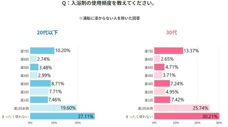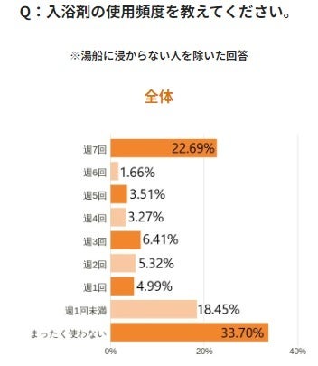 入浴剤を毎日使用しているひとの割合は湯船に浸かるひとのうちで2割以上、一方全く使わないというひとが33.7%という結果に。週1未満のひとは18.45%ということで、ときどき使う派・ほとんど使わない派が半々程度に分かれることがわかります。