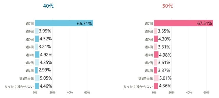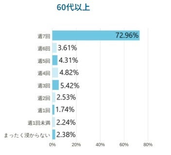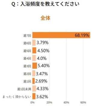 その結果、毎日入浴しているひとの割合は68%と高い数値に。9割以上のひとは週1回以上は入浴し、まったく浸からないというひとは3.62という非常に低い割合となりました。
