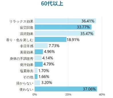 入浴剤を毎日(週7回)使うという割合は年代が上がるごとに増え、20代以下が9%なのに対し60代以上は26.18%と、17%もの開きが出ました。前述の結果から、20代で毎日(週7回)入る割合が約35%なのに対し、60代以上は約73%ですので、これに比例していると言えます。