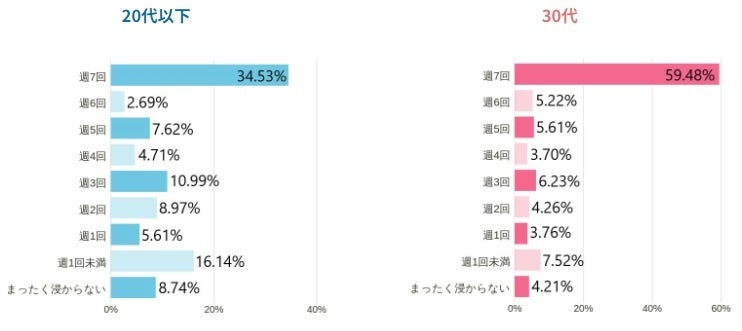 1000人規模調査時は週1以上のひとは8割以上という結果でしたが、より精査した今回の調査によると実に9割以上のひとが、週1以上はお風呂に浸かっているということがわかります。