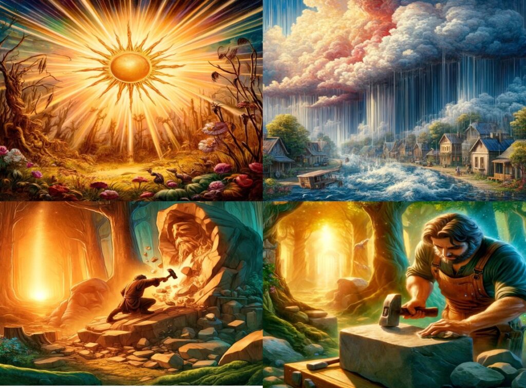 すると、石工は太陽になりました。自信満々で四方八方に強い光を放ちます。草花を枯らし、王子であっても貧しい者であっても同様に日差しを照りつけました。しかし、間もなく自分の力に飽きてしまい、またもや石工の心に不満がもたげてきました。