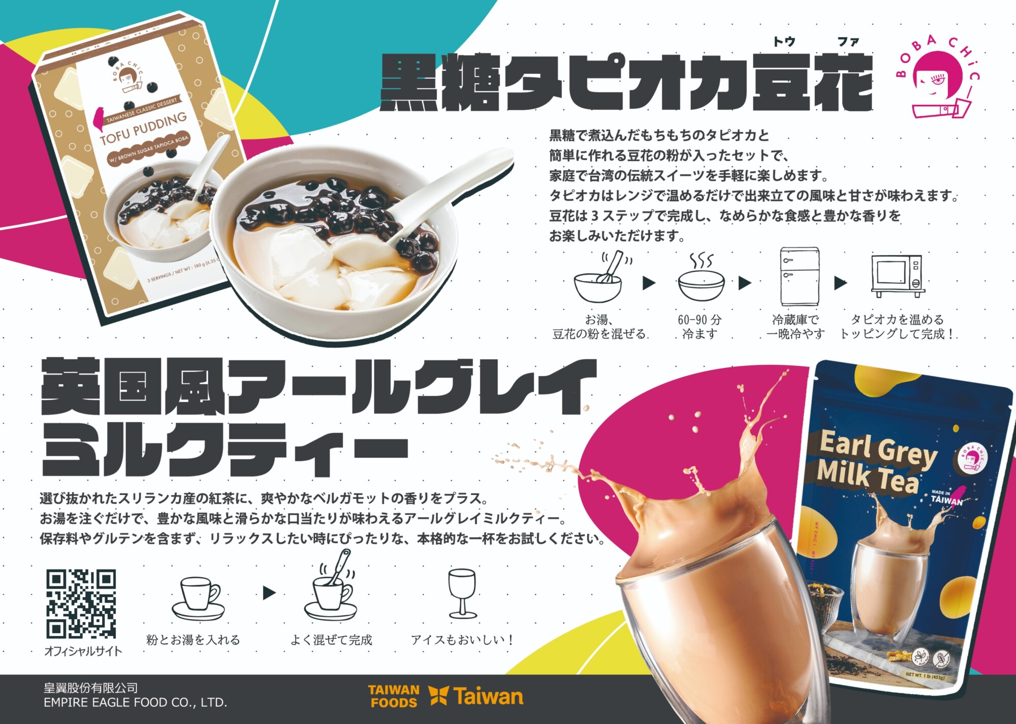 今回の試食会では、メーカーが独自開発した糖分が少なく、プチプチ食感が魅力の黑纖米(くろせんまい)や、台湾国民的スイーツ「豆花(ドウファ)」、芳醇なアールグレイの香りが楽しめるミルクティーをご用意しております。