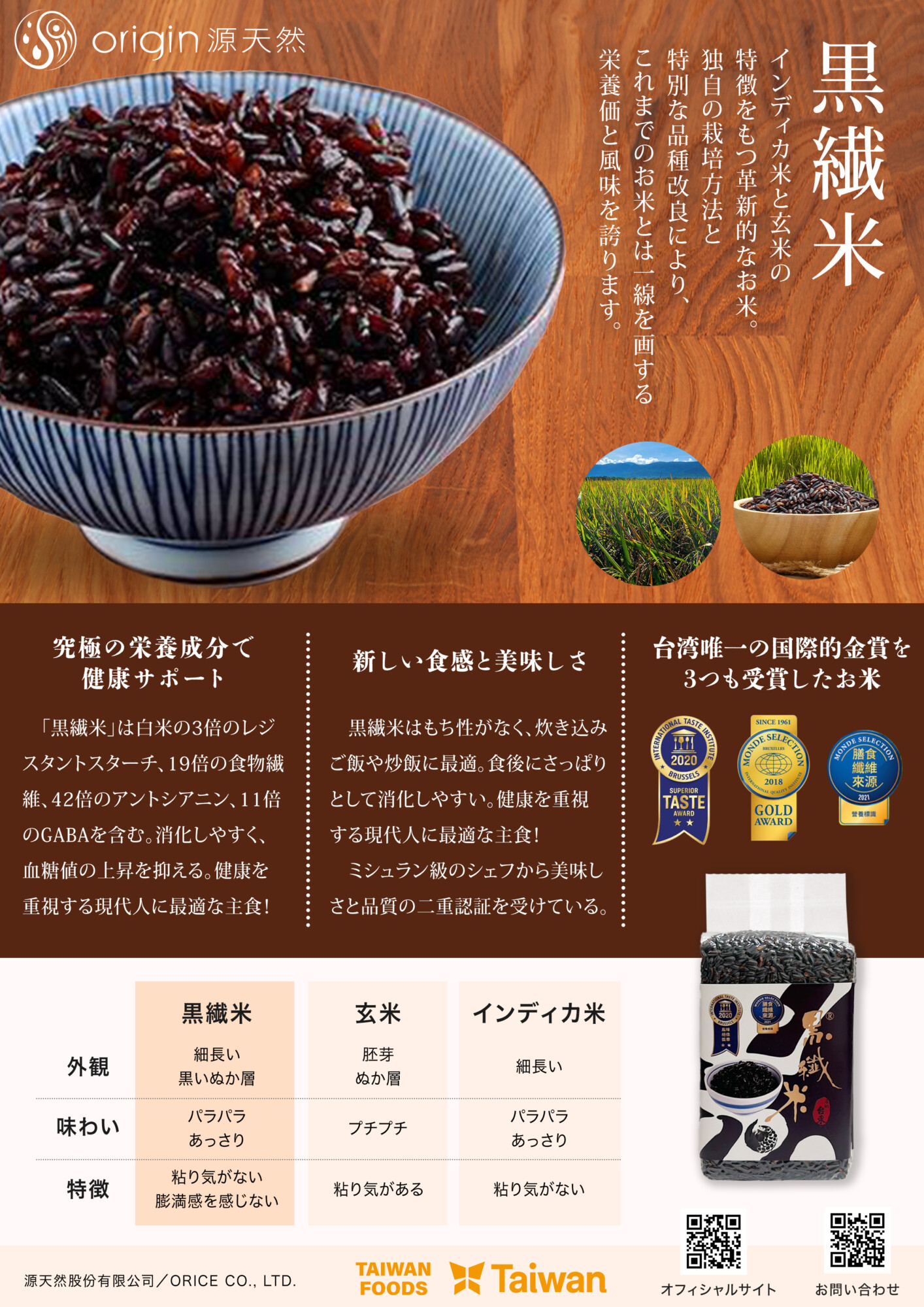 台湾の范宗宸博士が開発した「黒繊米™」は、インディカ米と玄米の特徴を持つ革新的なお米です。炊き上がりは粘り気が少なく、パラパラとした口当たりとあっさりとした味わいが特徴です。