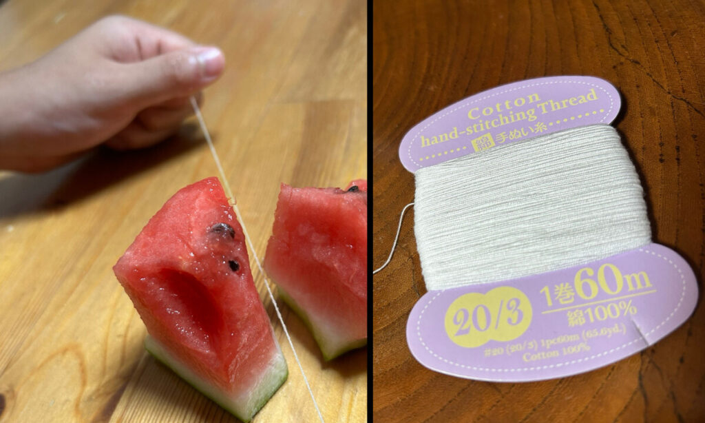 この方法で試してみたところ、小学生の子でも簡単にスイカを切ることができました! 使用したのは100均で購入した手縫い糸、コツは片方の手に糸の片方をくるくる巻きにして固定すること!