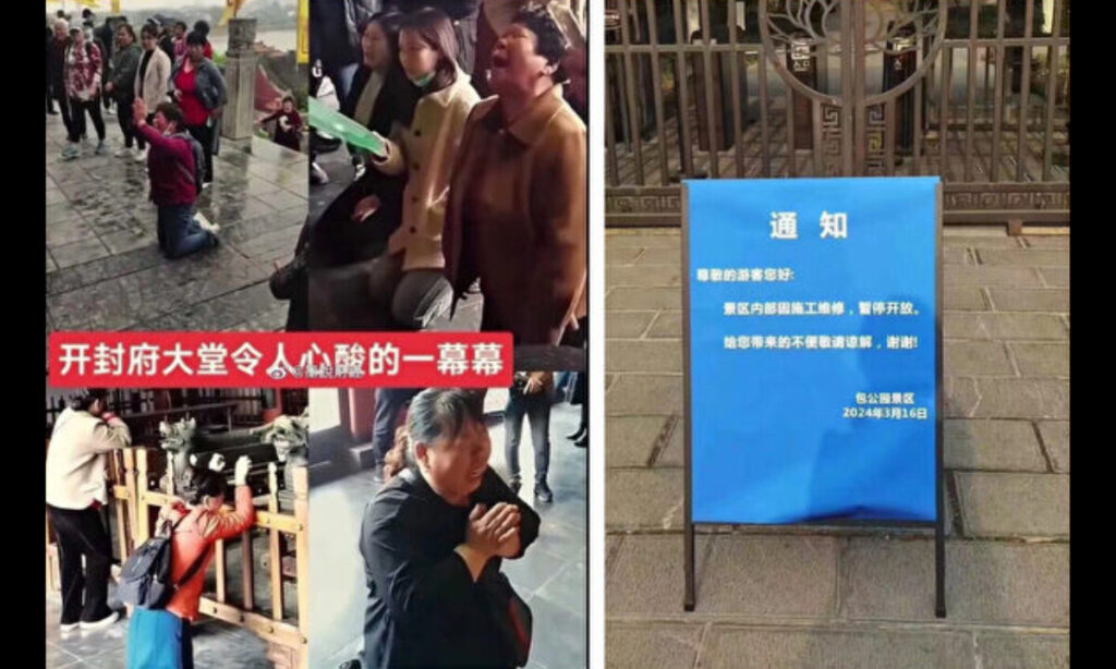 画像(左)は北宋時代の清廉潔白で公正無私の名裁判官「包公」を祀った廟(包公祠)で、跪いて拝み、自身が受けた冤罪や不当な扱いを泣きながら訴える中国の民衆。画像(右)は「メンテナンス」を理由に、突然閉鎖された包公祠。(SNSより)