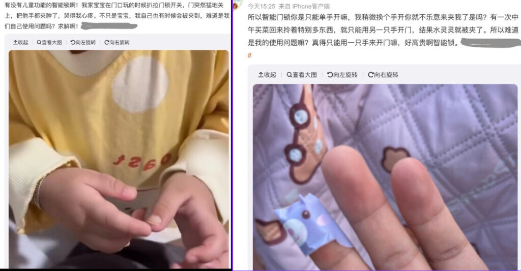 「スマートロックに手を挟まれた」の写真はSNSに数多く投稿されており、軽いケガでは皮膚が破けたり腫れたり、重傷の場合は流血あるいは骨折のケースもあるという。