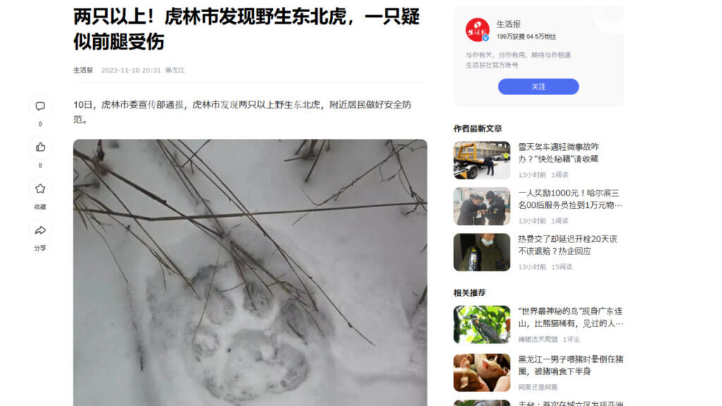 去年の今頃も、同省ハルビン市など複数の地域で、アムール虎に襲われたとみられる牛や犬の死骸が相次いで見つかっていた。当時は最大級の大雪警報が出されており、その影響があったかどうかは不明だが「雪で山が閉ざされたため、虎がエサを求めて下山した」と民間では思われている。