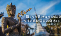 尊者は「あなたがそこまで頼むのなら、病気を一時的に向かいの扉に移しましょう。あなたに移したら、あなたには耐えられません。見ててください」と言いました。尊者は神通力を使い、病苦を向かいの扉に移しました。扉は最初ギシギシと音を立て、まるで裂けそうな様子でしたが、しばらくすると本当に粉々に裂けてしまいました。尊者は病気がなくなり、健康な姿を見せました。