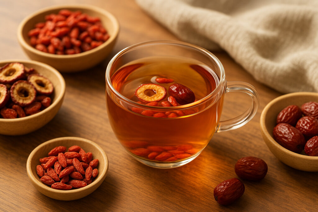 春分の時期は、肝の働きが活発になりすぎることで、脾胃(胃腸)の機能が低下しやすくなります。その結果、食欲不振や消化不良、お腹の張りなどが起こりやすくなります。そんなときにぴったりなのが、山査子(サンザシ)・クコの実・なつめを組み合わせたこのお茶。サンザシは消化を助け、クコの実は肝を養い、なつめは気血を補って胃腸をいたわります。春の養生におすすめの一杯です。