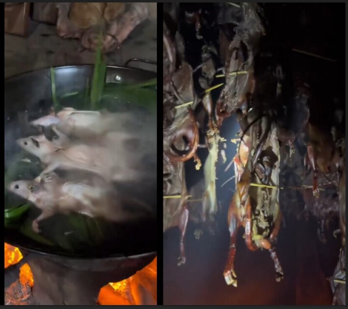 ネズミ料理と保存用に干しているネズミ。(動画よりスクリーンショット)