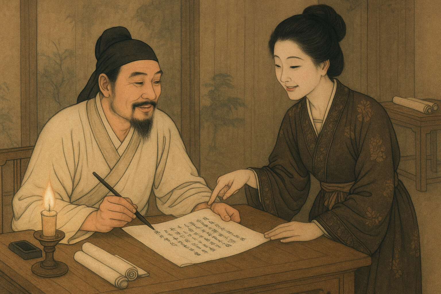 ふと振り返ると、妻が後ろから首を伸ばして詩をのぞき込んでいるのが見えました。李白はうれしくなって、詩の原稿を妻の方に差し出し、感想を聞いてみました。