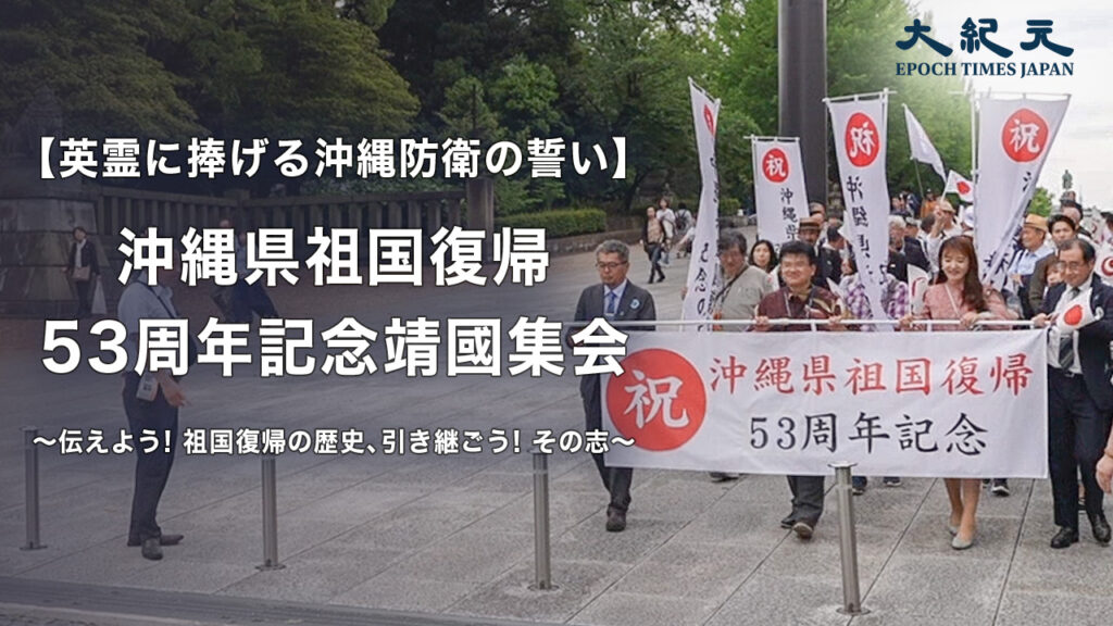 2025年5月18日、東京・靖国神社の靖国会館にて「沖縄県祖国復帰53周年記念靖国集会」が開催された。1972年(昭和47年)5月15日、米国との沖縄返還協定が発効し、沖縄の施政権が日本に返還された。この集会は、沖縄県の日本復帰53周年を記念し、戦後80年という大きな節目の年にもあたる中で、先人たちの努力を顕彰し、平和と発展への誓いを新たにする場として開催された。