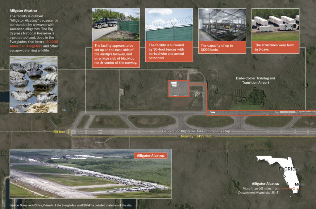 7月1日、フロリダ州エバーグレーズの奥地で、米国の最新の不法移民収容・送還施設「アリゲーター・アルカトラズ」が稼働し始めた。州当局による建設発表からわずか8日という異例のスピードで建設された。
