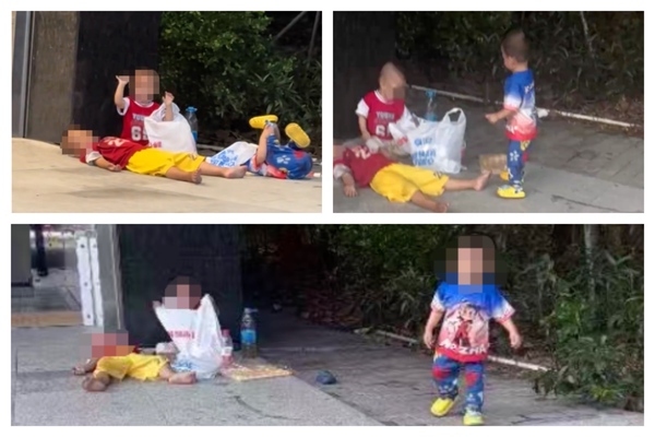 中国・広東省深センの地下鉄11号線・宝安駅の出口で、3歳の男児と1歳半の双子の妹が長時間放置されていた。撮影日は9月16日。周囲に大人の姿はなく、一人は走り回り、もう一人は敷物に横たわり、さらにもう一人は通行人に手を振っていた。そばにあったのは水とわずかな食べ物だけ。