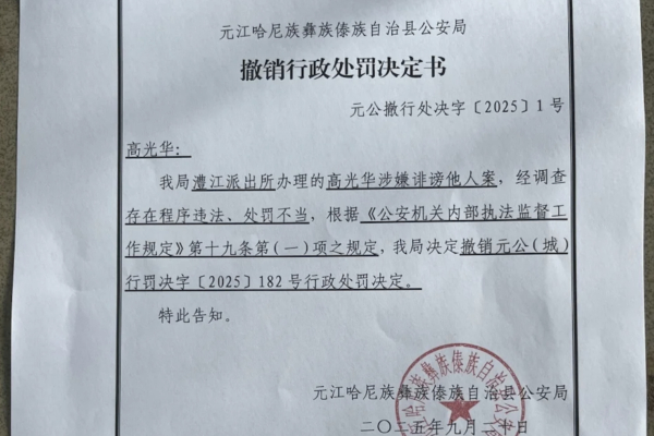 局長人事をめぐるSNS投稿後に下された拘留処分を撤回する決定書、2025年9月、雲南省元江県(スクリーンショット)