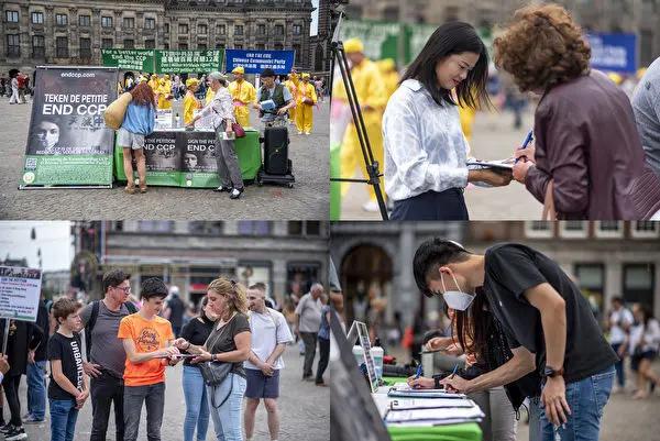 2021年7月3日、オランダの首都アムステルダムのダム広場で、人々が「中国共産党の終焉」を支持する署名を行った(韓德/大紀元)