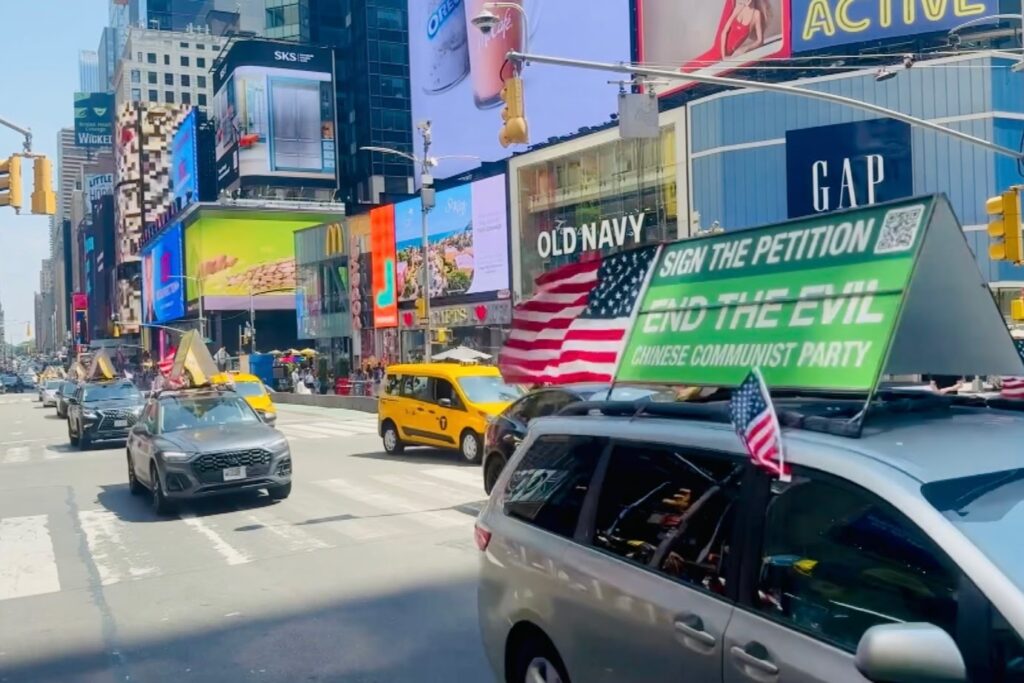 2025年7月6日に米ニューヨークのタイムズスクエアをパレードする車列隊。(王麗飛/大紀元)