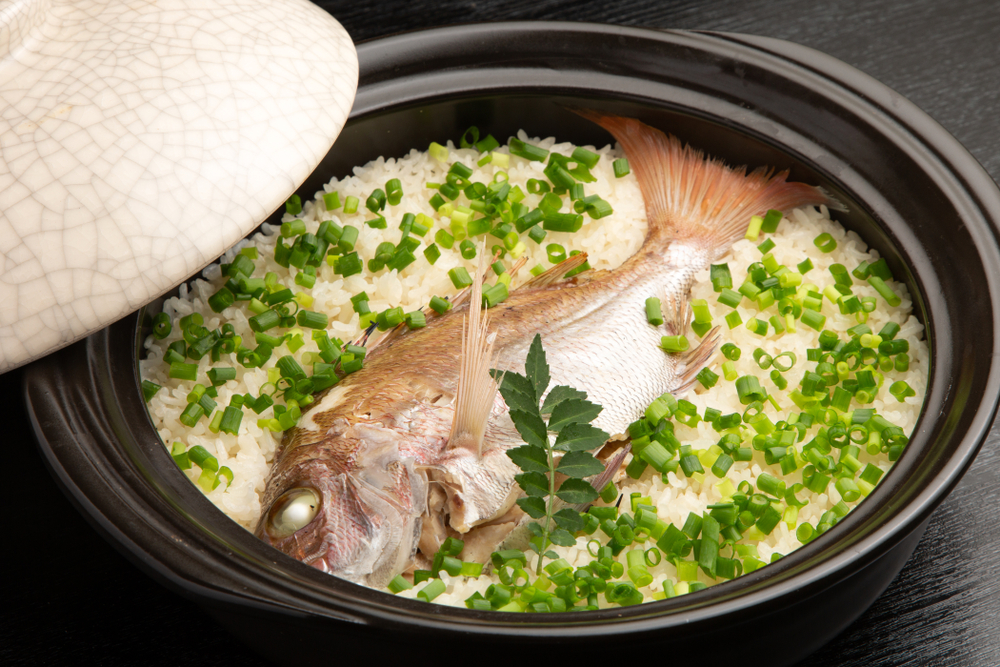 - 炊き上がったら鯛の骨を取り除き、身をほぐして軽く混ぜ、青ねぎや柚子の皮を散らして香りを添える。