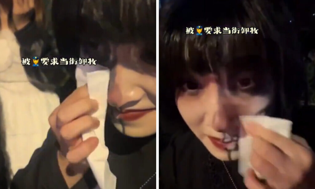 街中で警察にハロウィンのメイクを落とすよう命じられ、いやいや化粧を落とす若い女性、2025年10月31日、中国。(映像よりスクリーンショット)