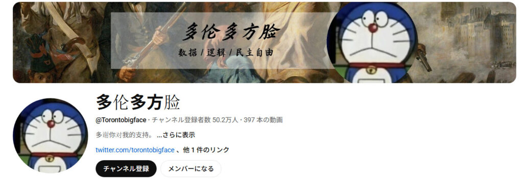 「多倫多方臉」のYouTubeチャンネルページ、ドラえもんのアイコンが特徴的。(YouTubeページよりスクリーンショット)
