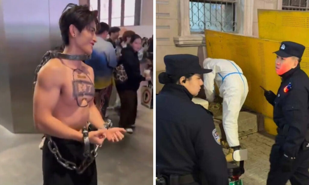 公安の取り締まりを受ける上半身裸で鎖を巻いた若者と「大白」、2025年10月31日、中国。(映像よりスクリーンショット)