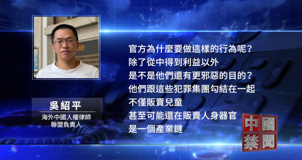 海外中国人権弁護士連盟の代表・呉紹平(ご・しょうへい)氏は、こうした犯罪グループがSNS「小紅書」で堂々と赤ん坊を売買できるのは、背後に当局の庇護があるからだと指摘する。「当局は金銭目的だけでなく、より邪悪な目的を持っている可能性がある。犯罪組織と結託し、子供だけでなく人の臓器までも売買している恐れがあり、すでに一つの産業になっている」と警鐘を鳴らした。さらに「上官正義氏は中国ではよく知られた反・人身売買の有志だが、もし彼が一般市民だったなら、拘留されるか、あるいは『消されていた』可能性すらある」と強調した。