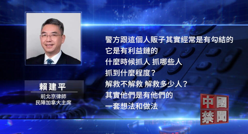 前・北京の弁護士で民主陣線カナダ支部主席の頼建平(らい・けんぺい)氏も「警察はしばしば人身売買組織と結託しており、そこには明確な利権構造がある。誰をいつ逮捕し、どこまで摘発するかも警察の都合次第だ。犯罪がなくなれば権限を使って利益を得る余地がなくなるため、警察と人身売買グループは持ちつ持たれつの関係にある」と指摘した。