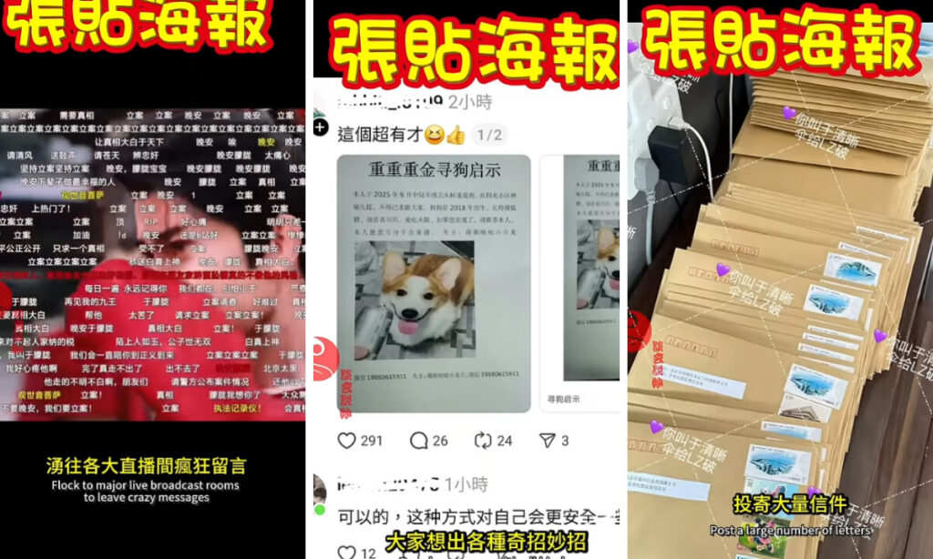 検閲を避けながら広がる中国国内での真相追及の動き。ライブ配信のコメント欄を埋め尽くす「立查!(徹底捜査を!)」「真相を!」の文字、于朦朧の愛犬・福麗(フーリー、殺害されたとされる)の写真を使った「尋ね犬ポスター」、捜査機関へ調査を求める大量の手紙――創意的な方法で訴えが続いている。(画像=SNSより)