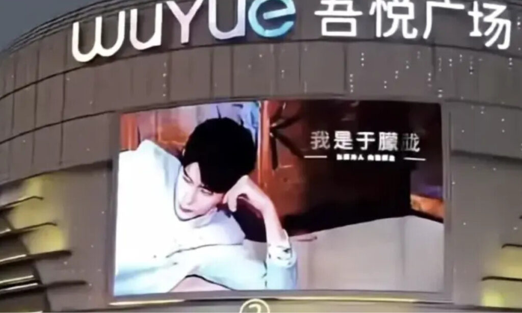 ファンが自腹で商業施設の大型スクリーンに于朦朧の映像を投影。(画像=YouTube・V4Democracyより)