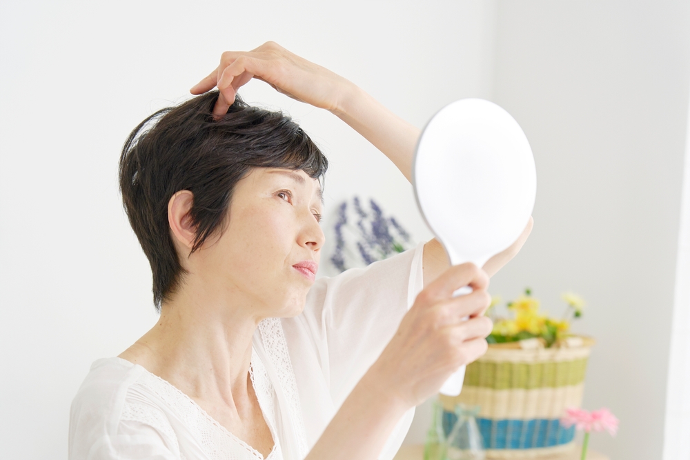 産後の抜け毛だけでなく、更年期もまた女性の抜け毛が増える時期の一つです。ある50歳前後の女性は、分け目やつむじの部分が徐々に広がり、地肌が黄色っぽく見えるほどになっていました。