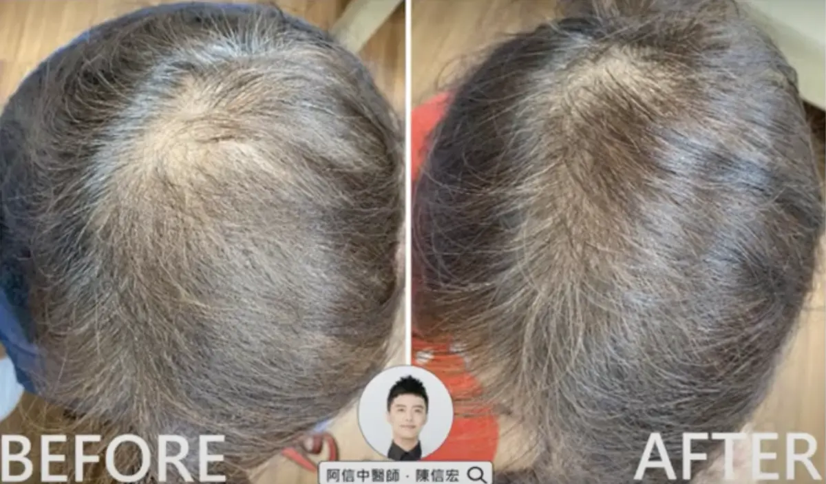 陳宏信医師が彼女の体調や脈、舌の状態を詳しく観察したところ、「肝血虚」と「腎経不足」の症状が見られ、さらに更年期特有の女性型脱毛症(いわゆる女性の男性型脱毛)であることがわかりました。治療では、肝腎を補う「二至丸(にしがん)」を用いると同時に、ホルモンバランスを整える「知柏地黄丸(ちばくじおうがん)」を併用しました。6~8か月の治療を経て、抜け毛は大幅に改善しました。研究によっても、「知柏地黄丸」は女性の更年期症状の改善に効果があることが確認されています。