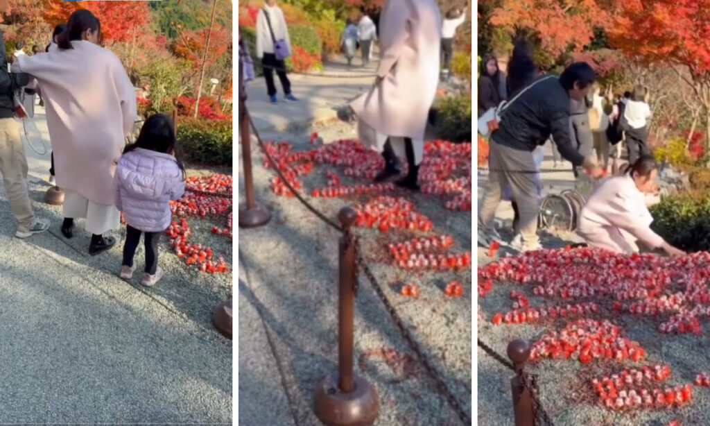 映像によれば、女性は一度立ち去ったあと再び戻り、さらに達磨を崩していた。夫が腕を引いて止めようとしても行動をやめず、同行していた幼い子どもたちの前で破壊行為を続けた。偶発的な動作ではなく、明確な意図をもった行動であったと見られる。