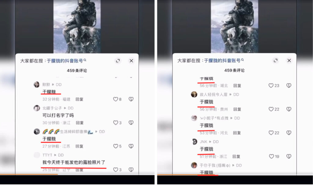 (以前は検閲で表示できなかった「于朦胧」の名前が、次々と投稿され表示されるようになった抖音のコメント欄)