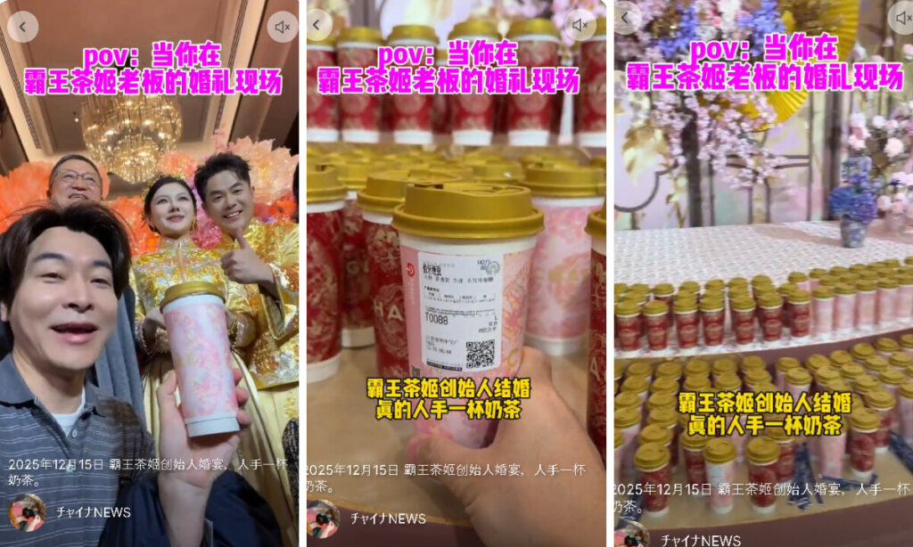 ミルクティーで乾杯する結婚式。派手さより話題性を取りに行くこの感覚は、中国の新世代富裕層の価値観を象徴する一場面として受け止められている。