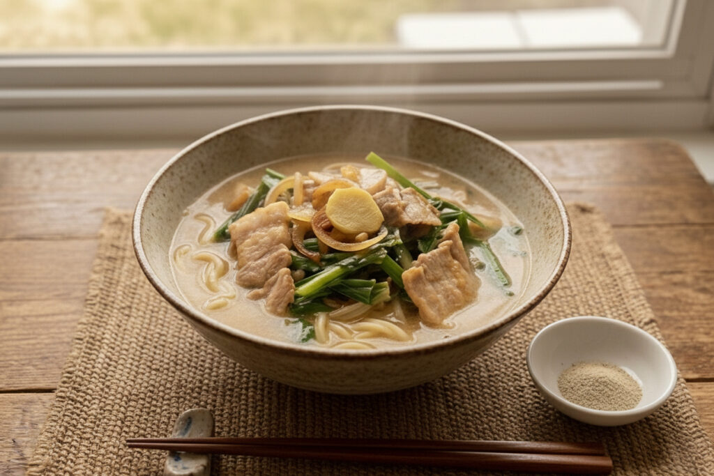 日本のラーメンは、温かいスープとほどよい脂のコクを特徴とします。特に骨を使ったスープは、体を温める食事として冬に適しています。そこに、にら、玉ねぎ、豚肉を加えることで、日常食でありながら、冬の養生を意識した一杯になります。