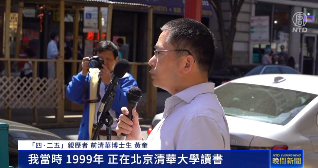 法輪功の集会で発言する黄奎氏、2022年4月(NTD新唐人テレビより)