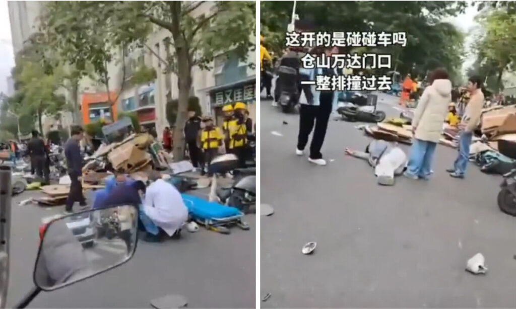 現場の様子。2025年12月22日、中国・福建省福州市で、乗用車が一方通行を逆走し、高速で歩行者や自転車に突っ込んだ(ネット上の動画よりスクリーンショット)