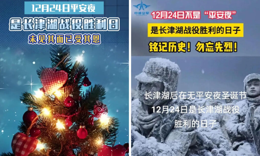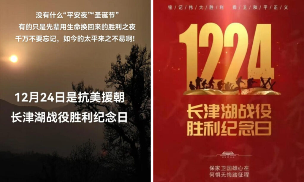 中国では近年、この日を「クリスマスイブ」と呼ばなくなりつつある。代わりに登場したのが「長津湖勝利日」という名称である。1950年の朝鮮戦争で、中国軍がアメリカ軍と戦った長津湖戦役をたたえるという名目の記念日だ。