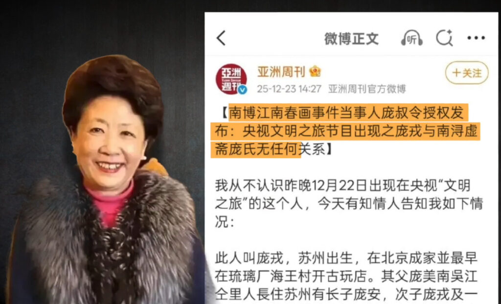 問題となったのは、12月22日に放送された中国国営テレビの番組である。司会者は出演者の龐戎氏を、江南の著名な収蔵家一族・龐莱臣家の子孫だと紹介した。番組内で龐戎氏は、一族の歴史や文化にまつわる話を語り、視聴者に「本物の一族関係者」であるかのような印象を与えた。