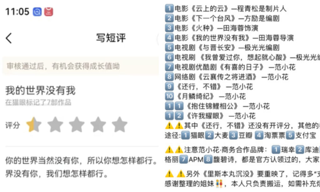 右:于朦朧事件に関係するとされ、ボイコット対象となっている人物や作品を、ネットユーザーがまとめた一覧。(いずれもネット画像)
