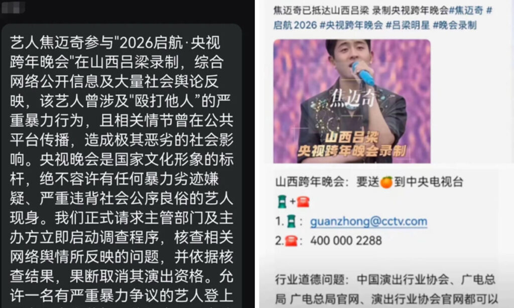 右:焦邁奇が出演したとされる年越し番組の映像と、抗議や通報を呼びかける書き込み。(いずれもネット画像)
