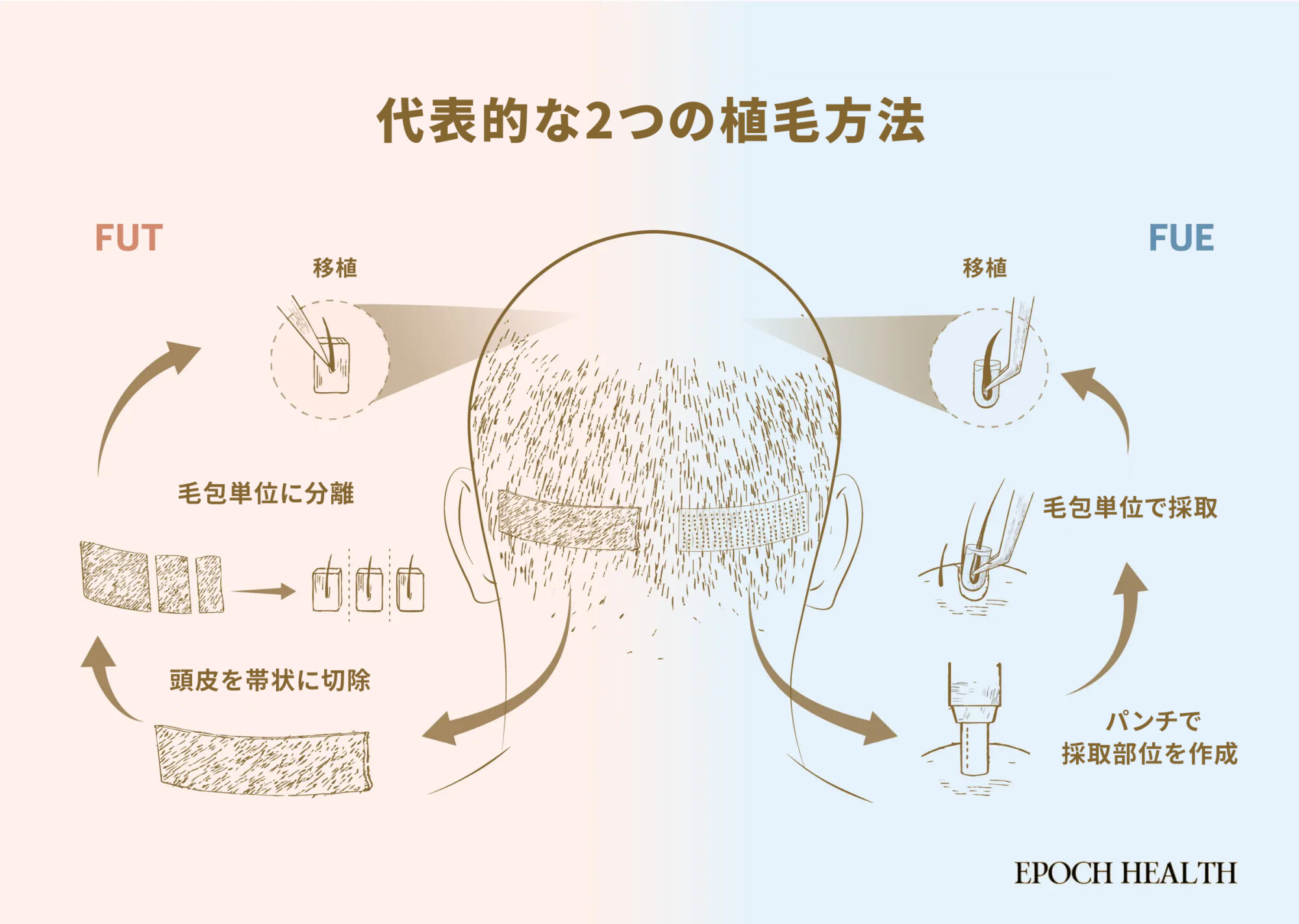 毛髪移植手術では、一般的に2つの主要な方法が用いられています。