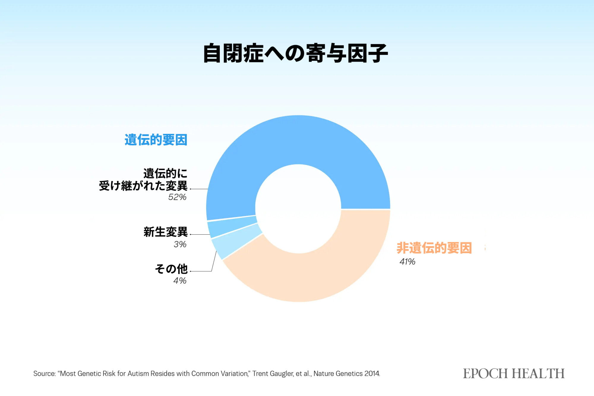 マウントサイナイ・アイカーン医科大学Seaver自閉症研究・治療センターのジョセフ・バックスバウム所長はエポックタイムズに、自閉症には強い遺伝的要因があると語っています。ただし、自閉症と遺伝子の関係は常に明確に見えるとは限りません。