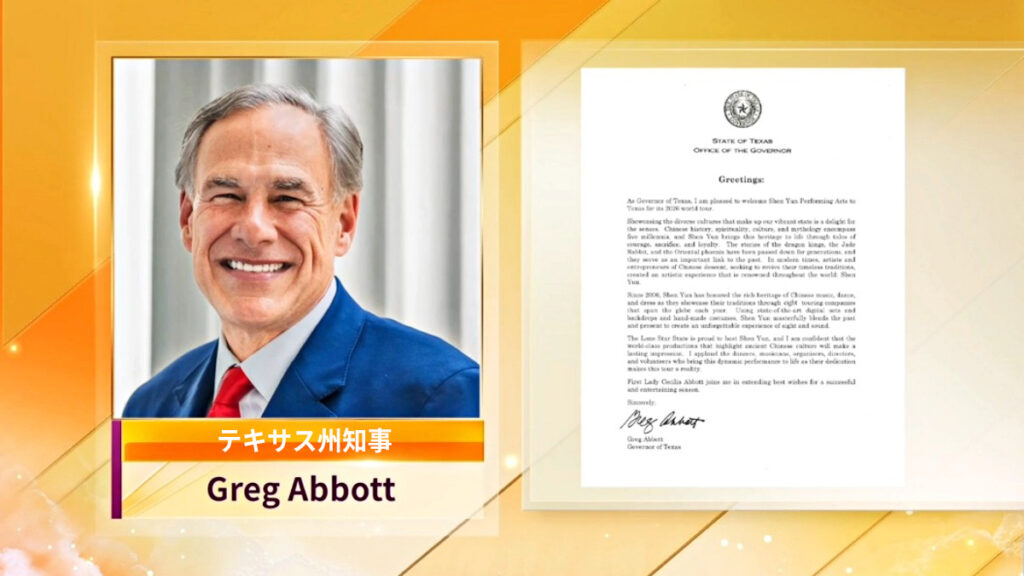 アボット知事は、祝賀で「テキサス州知事として、2026年の世界ツアーの一環としてテキサスを訪れる神韻芸術団を歓迎できることを心から大変うれしく思う」と語った。