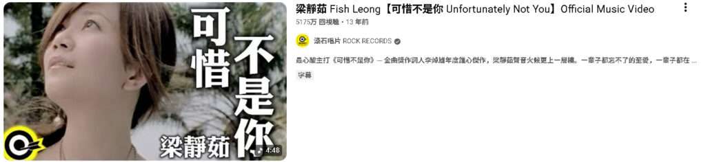 (マレーシア出身の歌手・梁静茹のヒット曲「可惜不是你」。邦訳は「あなたでないのが惜しい」。英題は「Unfortunately Not You」。公式ミュージックビデオ)