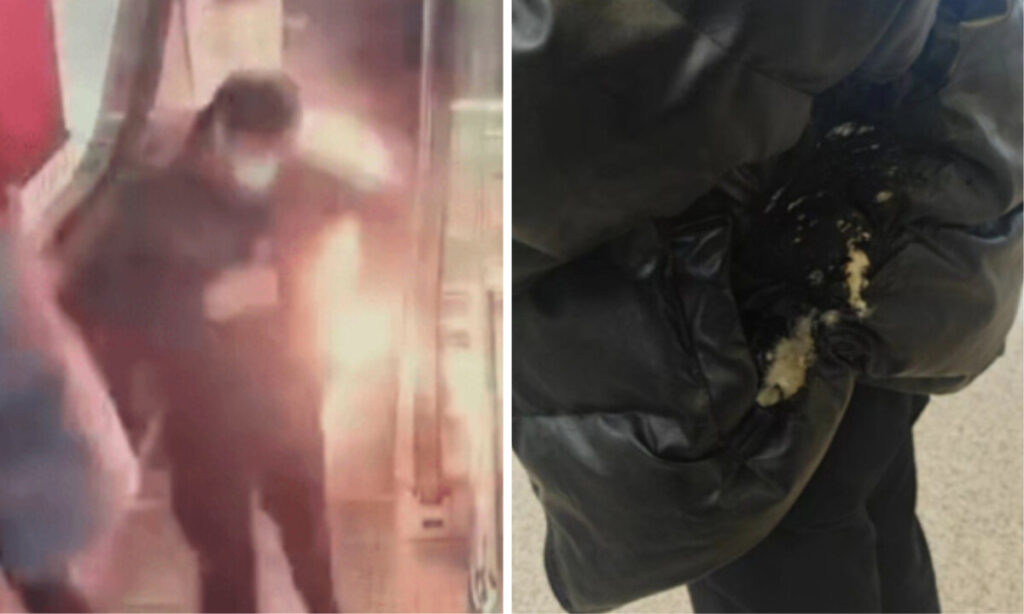 監視カメラ映像によると、乗客がエスカレーターでホームに降りた直後、上着の左側から激しい炎が上がった。周囲の利用客は驚いて距離を取り、ホームは一時騒然となった。