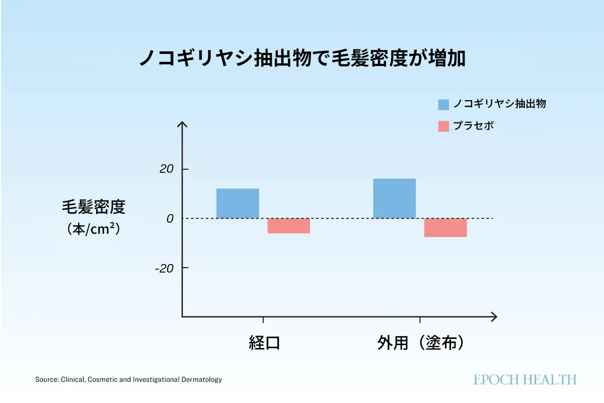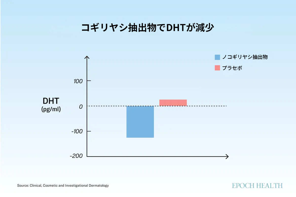 2023年の軽度~中度のアンドロゲン性脱毛症の80人を対象とした研究では、ノコギリヤシエキスを16週間、毎日経口または外用で使用したところ、脱毛が20~30%減少し、髪密度が5.2~7.6%増加したと報告されました。また、経口摂取の参加者ではDHTレベルの低下も示されました。
