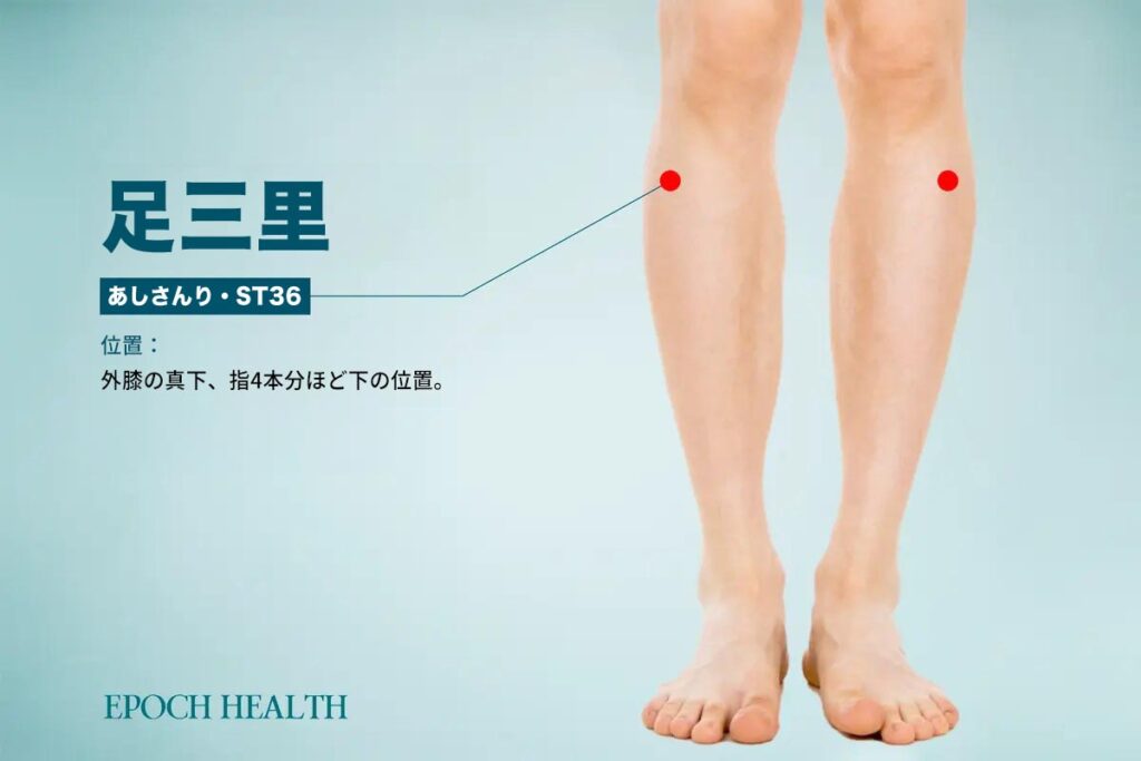 足三里(あしさんり):膝の外側、膝下から指4本分下。健胃強壮の要で「長寿のツボ」とも呼ばれ、胃腸機能を高めて便秘を和らげる。